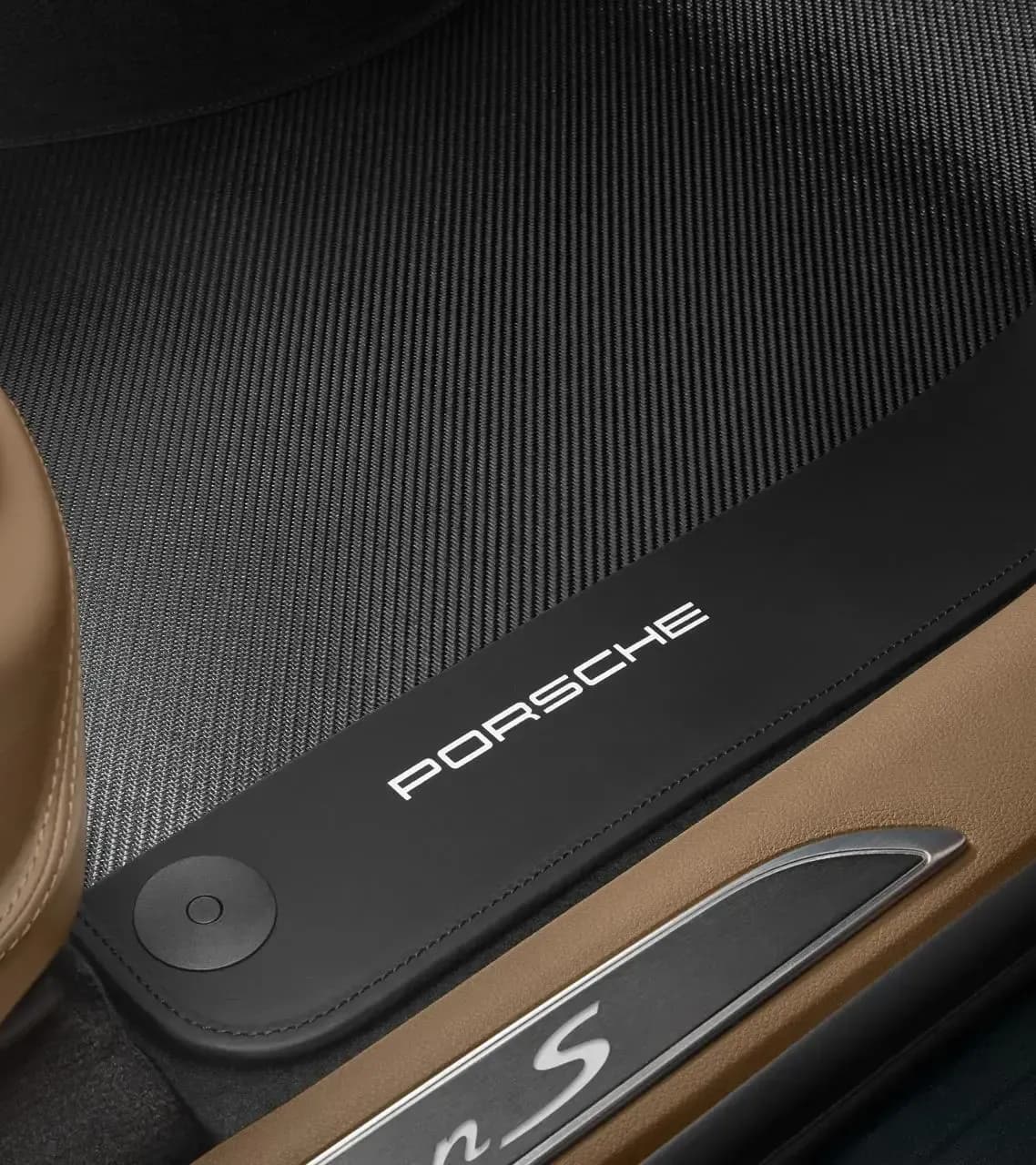 Vierteiliger Satz aus Echtcarbon mit Ledereinfassung und Naht in Schwarz. Inkl. Ledereinleger in Schwarz mit „PORSCHE“ Schriftzug.
