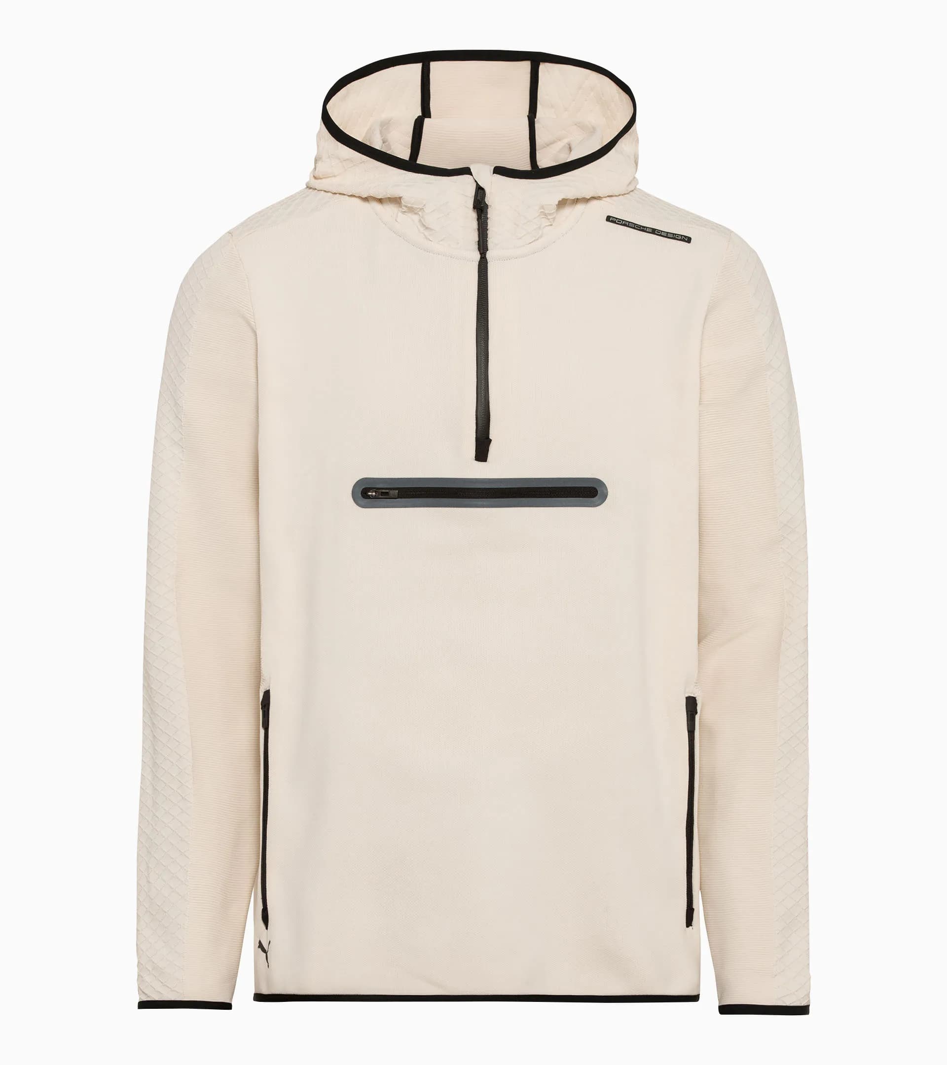 The EvoKNIT® midlayer jacket brings together a functional sport jacket and an exclusive design statement. The Porsche DNA in every fibre is highlighted by, among other things, three different knitting patterns, the 3-panel hood construction and the high-quality workmanship of the jacket.The seamless kangaroo pocket, the chest pocket with zip fastener, the stand-up collar in the hood and the bungee cord with Porsche Design branding add visual accents. The elastic edging on the hood, sleeves and hem provides excellent wearing comfort. The central 1/4 zip fastener completes the stylish design.