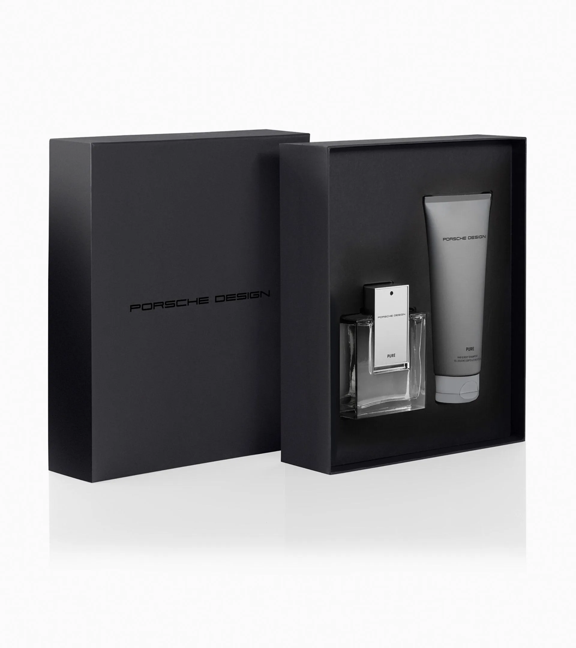 High-quality gift set for men comprising men's fragrance and shower gel. The Porsche Design Pure Eau de Toilette and Hair & Body Shampoo exude modern style.